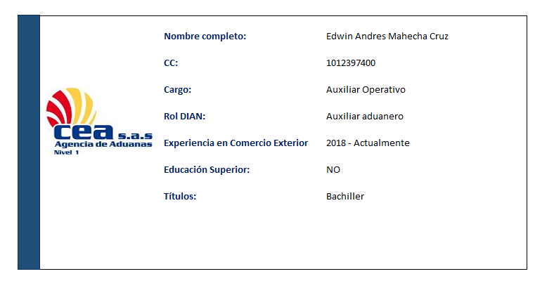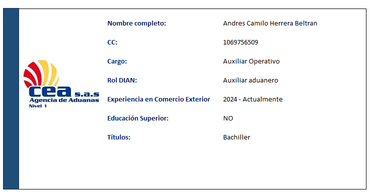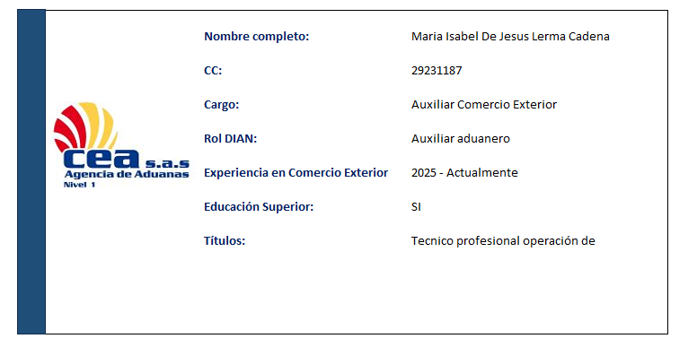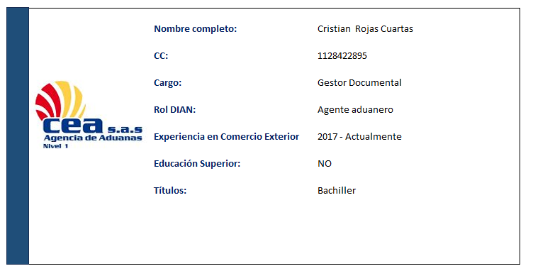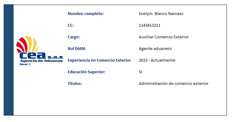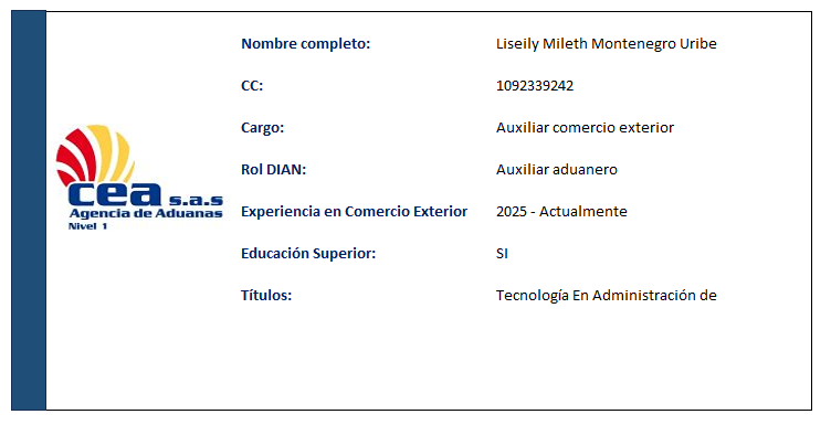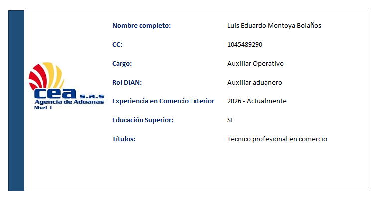 AGENCIA DE ADUANAS COMERCIO EXTERIOR ASESORES S.A.S. (AGENCIA DE ADUANAS CEA S.A.S.) fue fundada en 1982 por William Londoño Jaramillo, Luís Humberto Rojo y Luís Guillermo Gómez Pareja. Con más de 40 años de experiencia, se ha consolidado como una empresa líder en comercio exterior, con presencia nacional y sucursales en varias ciudades de Colombia, iniciadas en Turbo (1985), Santa Marta (1989), Cartagena (1990), Buenaventura (1995), Bogotá (2004) y Rionegro, lo que nos posiciona como una de las empresas líderes.
